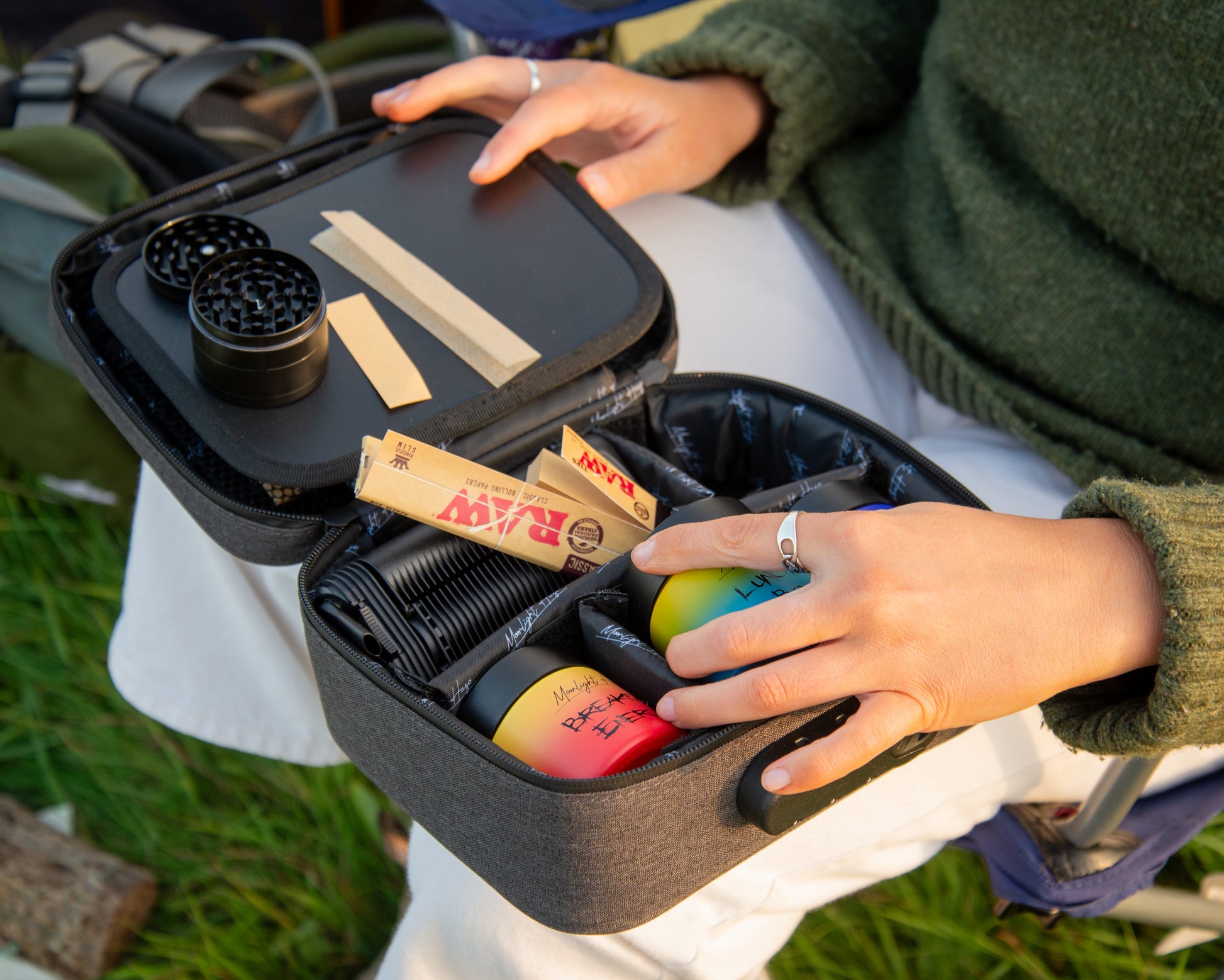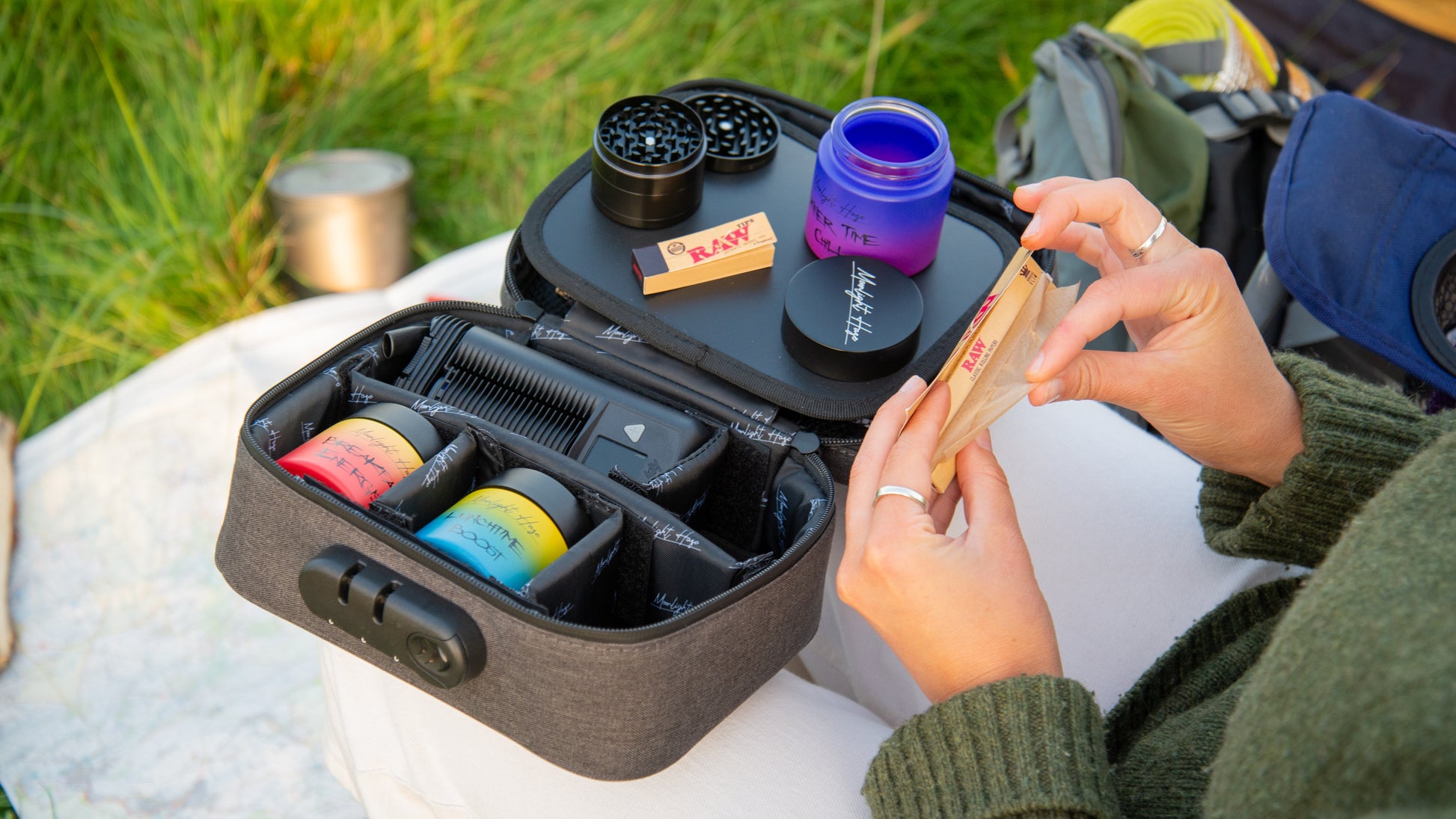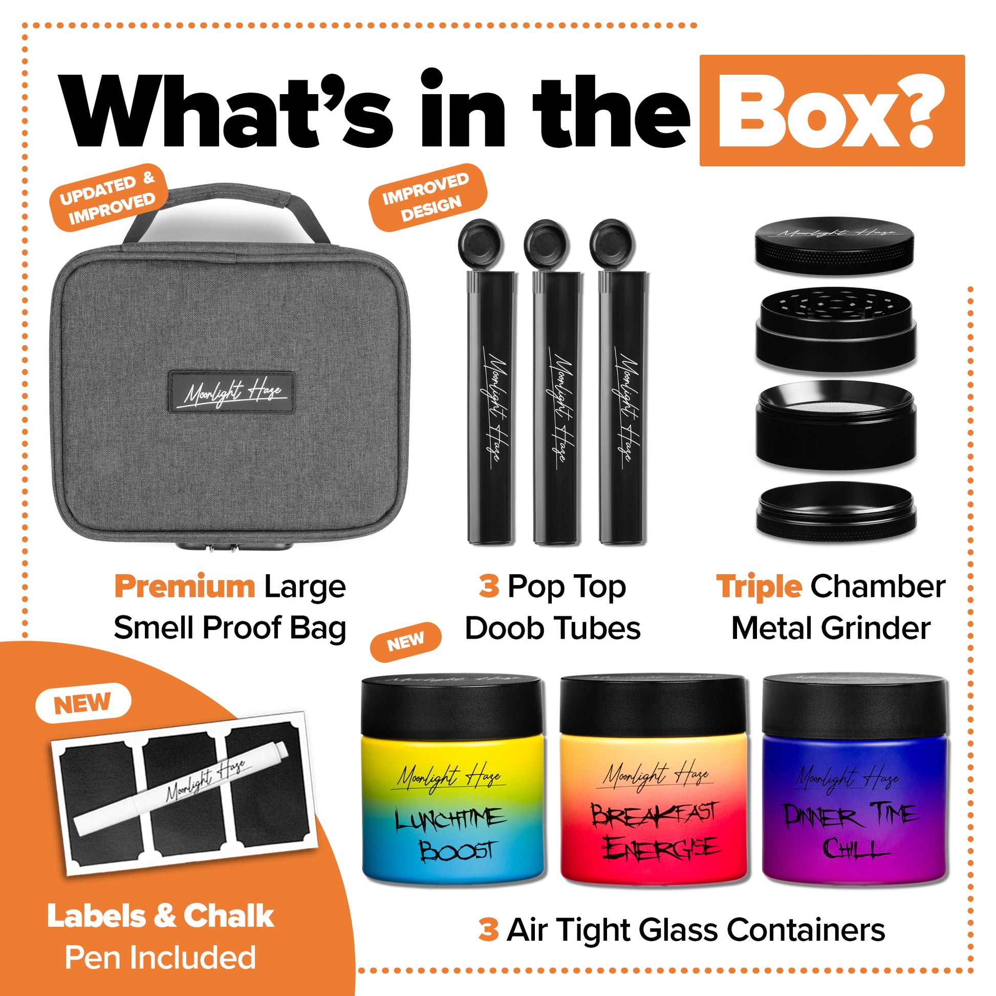Keep your medicinal herbs fresh and discreet with this smell-proof bag featuring activated carbon lining. Designed for convenience and protection, it includes a secure lock, prep tray, adjustable removable dividers, elastic storage, storage net, thick foam walls, and sealed zippers. The set comes with a 2" metal grinder, three stash jars (each holding 5-7g) with Moonlight Haze’s signature design plus chalkboard labels and marker, and three pop-top doob tubes. Backed by a 12-month warranty, this kit offers organized, odor-free storage wherever you go.