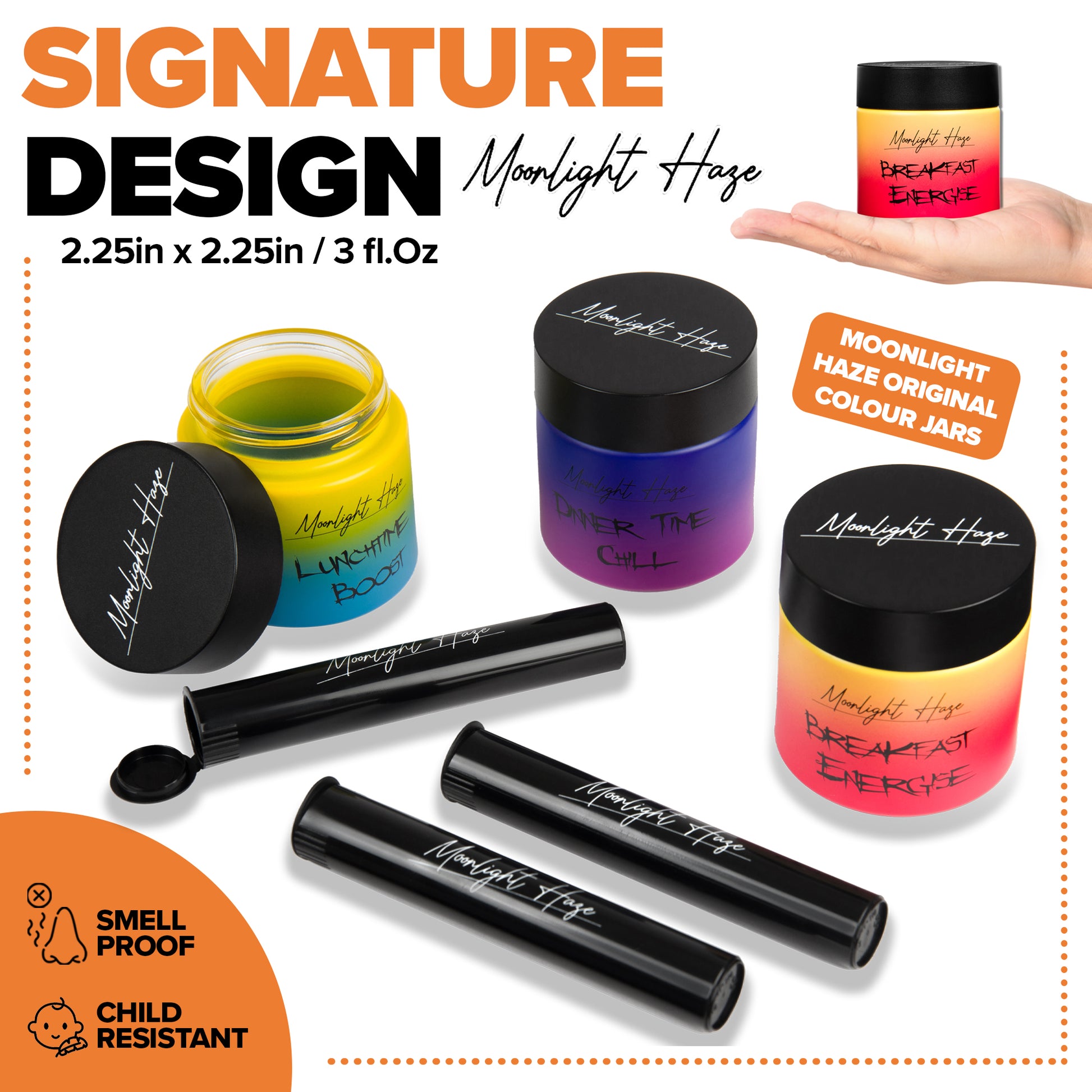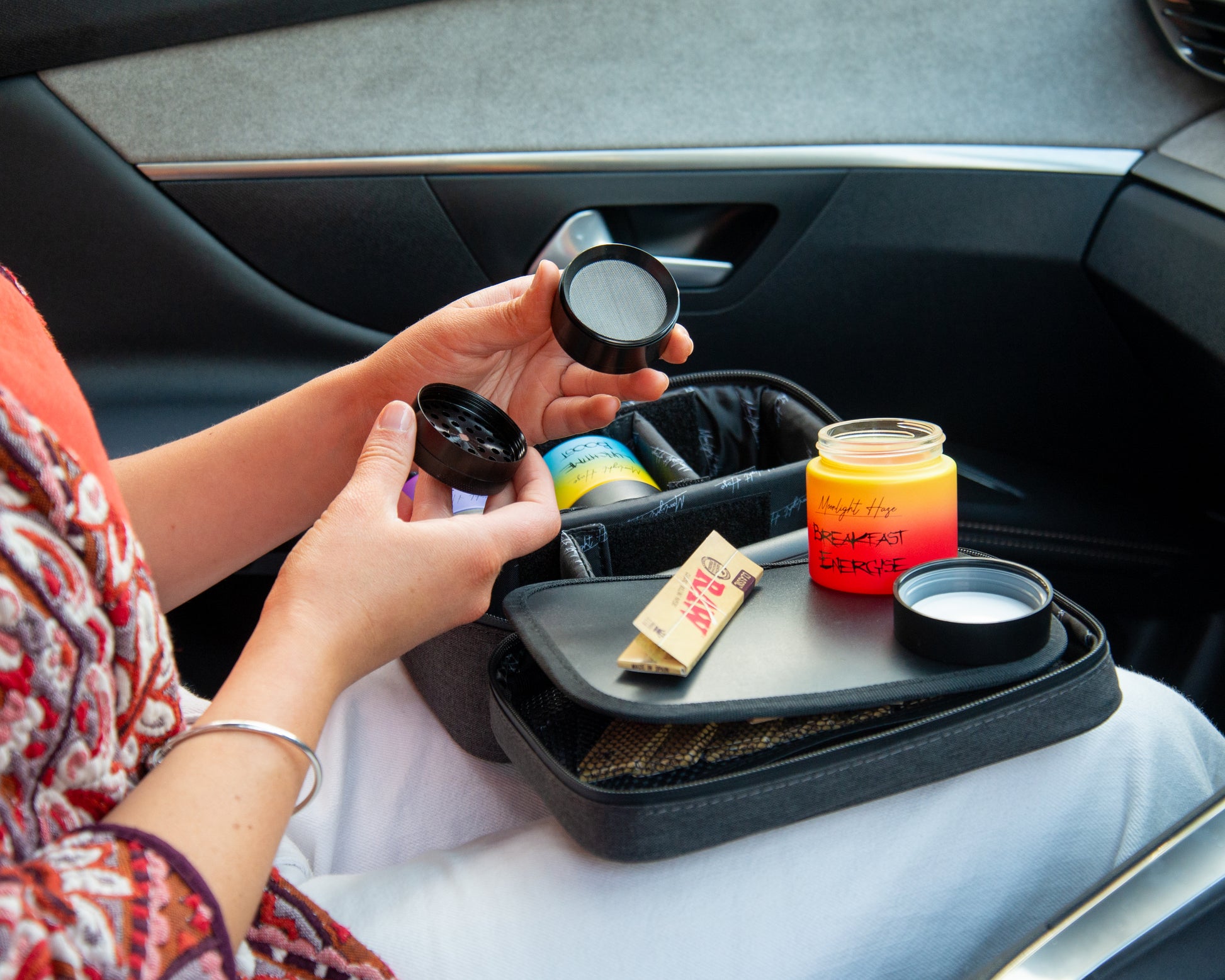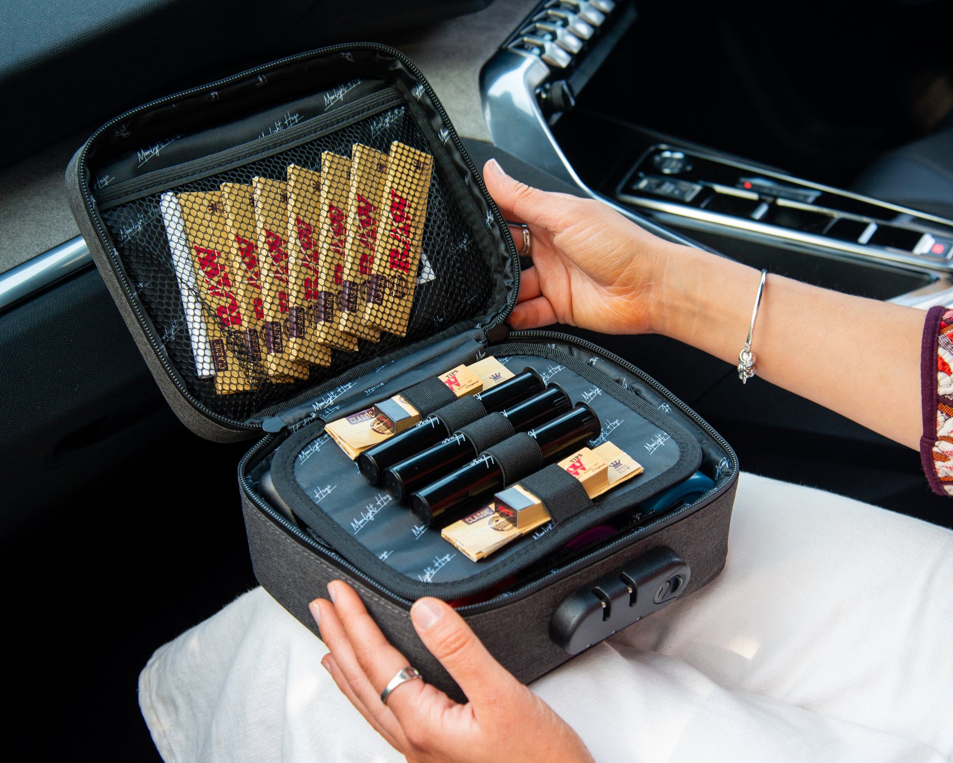 Keep your medicinal herbs fresh and discreet with this smell-proof bag featuring activated carbon lining. Designed for convenience and protection, it includes a secure lock, prep tray, adjustable removable dividers, elastic storage, storage net, thick foam walls, and sealed zippers. The set comes with a 2" metal grinder, three stash jars (each holding 5-7g) with Moonlight Haze’s signature design plus chalkboard labels and marker, and three pop-top doob tubes. Backed by a 12-month warranty, this kit offers organized, odor-free storage wherever you go.